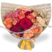 Уменьшенный: роза красная - 1 шт., роза кустовая красная - 2 шт., роза кустовая оранжевая - 1 шт., гвоздика персиковая - 1 шт., роза персиковая - 1 шт., хризантема кустовая розовая - 1 шт., статица белая, упаковка, лента.